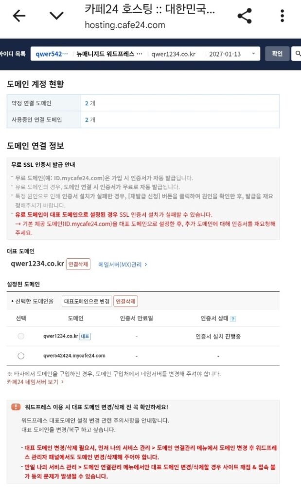 카페24가 들어가지 않은 고유주소로 설정해 놔야 한다.